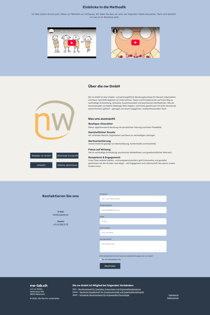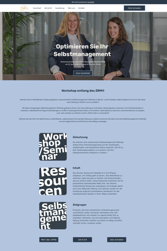 Die gesamte Website des nw Lab wurde aus einer optimierten Mischung aus Künstlicher Intelligenz und gesundem Menschenverstand entwickelt und aufgebaut. Bestehende Bilder der nw GmbH wurden integriert, Farben und Pakete mithilfe von KI entlang der CI-Vorgaben der Firma angepasst. So ist eine eigenständige Plattform entstanden, die dennoch klar mit der Marke verbunden bleibt.